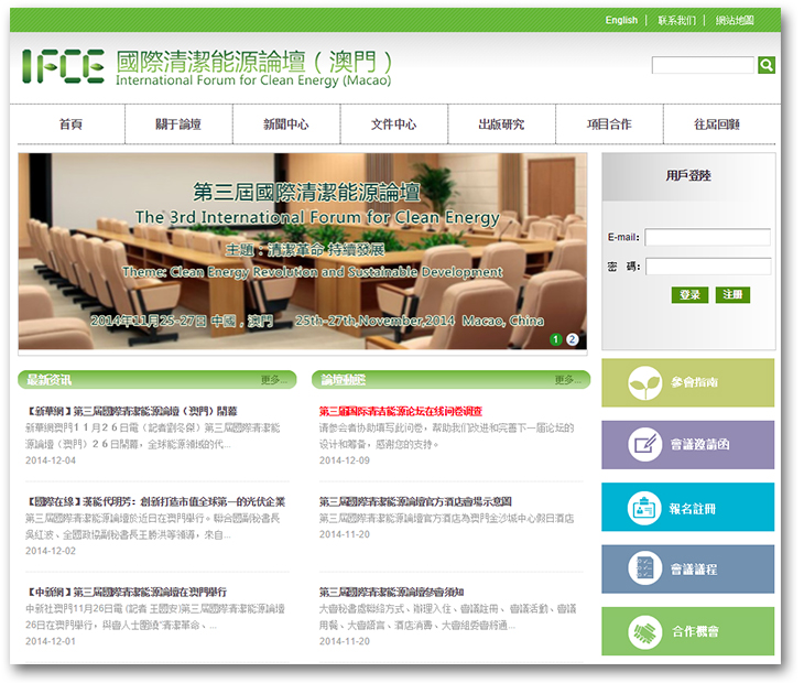 IFCE國際清潔能源論壇(澳門)會(huì)議網(wǎng)站成功完成全新改版上線,清新的風(fēng)格讓人耳目一新。上線后對會(huì)議的信息發(fā)布以及會(huì)議的全程管理起到了至關(guān)重要的作用。
