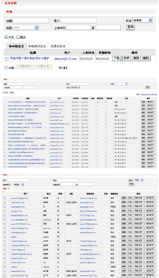 對論文庫整個(gè)論文的銷售統(tǒng)計(jì),針對用戶統(tǒng)計(jì)銷售額及盈余,中文文章和英文文章的分成比例分開計(jì)算,并可導(dǎo)出數(shù)據(jù),便于核算,包括:論文銷售管理、用戶銷售管理。