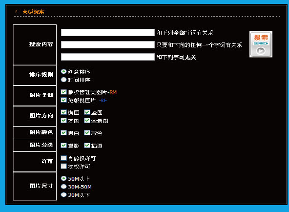 基本搜索:可根據(jù)圖片的編號、攝影師、關(guān)鍵字、標題進行匹配搜索,還可以按照版權(quán)類別(RM/RF )或肖像權(quán)和物產(chǎn)權(quán)來進行分類搜索;高級搜索:可根據(jù)圖片不同條件的關(guān)鍵字、形狀、大小、類別來精確查詢;結(jié)果中查詢:可在現(xiàn)有結(jié)果中進行再次搜索。
