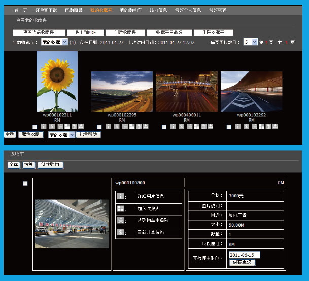 選擇滿意的圖片可以放進購物車中,可以查看圖片信息、移除圖片、收藏圖片和計算圖片價格,在購物車中可以針對其中的圖片進行結(jié)賬。