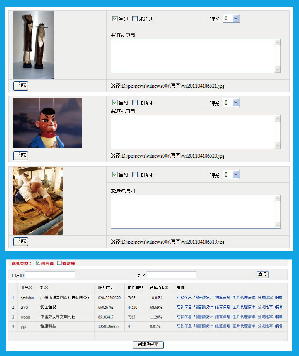 根據(jù)訂購日期和圖片名稱可進行查詢,顯示用戶訂購的RM圖片具體信息,可查看訂購會員的具體資 料,無論是否具有該尺寸的圖片,支持郵件信息反饋賣家身份審核:根據(jù)用戶名,姓名,審核狀態(tài)來查詢相應(yīng)用戶,可查看賣家提交的詳細信息來審核用戶是否具有賣家的資格。