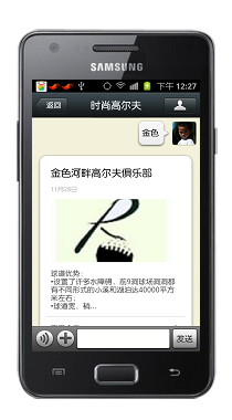 當(dāng)用戶對時(shí)尚高爾夫公眾平臺詢問金色時(shí),系統(tǒng)會從服務(wù)器數(shù)據(jù)庫找詢關(guān)于金色的所有信息,并組合成為圖文并茂的信息回復(fù)自動發(fā)送給用戶。
