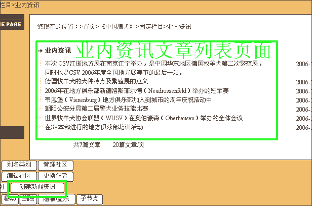 3.從這個頁面出發(fā),繼續(xù)尋找,來到我們要添加文章的界面。例如,我們要在“業(yè)內(nèi)資訊”欄目下添加新文章,那么就要進(jìn)入到“業(yè)內(nèi)資訊”文章列表所在頁面。在頁面下方會見到同上圖一樣的一群按鈕。注意:一定要進(jìn)入真正的列表頁面,而不是首頁或其父類頁面。列表頁才是我們的“操作車間”。對于這些按鈕不要眼花,我們常用到的僅僅是其中兩個而已。點擊“創(chuàng)建新聞資訊”按鈕,進(jìn)入編輯頁面:
