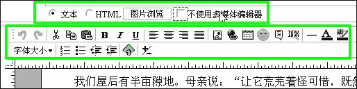 6.先演示使用媒體編輯器的情況。在不勾選“不使用多媒體編輯器”時,就是使用媒體編輯器,這時的編輯是可視化的,只要按照我們平常在Microsoft office word中寫出來的結(jié)構(gòu)原樣粘貼,上傳以后的頁面也會如此排列。這種方式比較簡單、明了,所見即所得,適合HTML基礎(chǔ)薄弱的用戶,但缺點是對圖片文字位置的控制能力較差,產(chǎn)生很多垃圾代碼,占用資源也很大。文字編輯功能同我們?nèi)粘J褂玫腗icrosoft office word幾乎是一樣的,可以進(jìn)行字號、大小、顏色等修改。編輯器下面的“加號”和“減號”可以使編輯窗口擴(kuò)大或縮小,有利于編輯的方便。