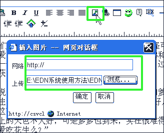 7.接著插入圖片。先用鼠標(biāo)點擊在編輯器內(nèi)需要插入圖片的位置,點擊上面的插入圖片標(biāo)記,然后彈出“插入圖片”對話框??梢园丫W(wǎng)絡(luò)上的圖片地址填入;也可以雙擊“瀏覽”,從本機(jī)上傳一張圖片。我上傳了本地一張圖片。最后點“確定”: