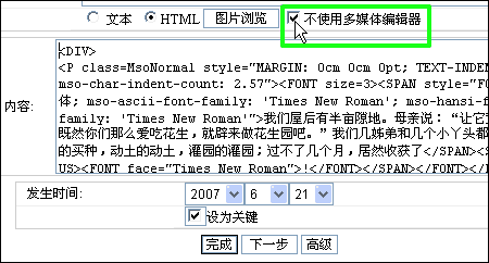 11.在勾選“不使用多媒體編輯器”時,編輯狀態(tài)就是有代碼的樣子,這種狀態(tài)適合有一些HEML代碼基礎(chǔ)的用戶來使用,它的好處就是定位準(zhǔn)確、垃圾代碼少、占用資源小。使用方法就跟前面一樣,把標(biāo)題、作者添好,把代碼編寫好,點擊完成即可提交。