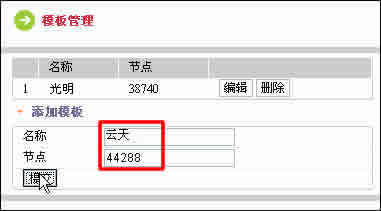 打開“模板管理”頁(yè)面。名稱填入模板名稱,節(jié)點(diǎn)就填定義為模板的社區(qū)節(jié)點(diǎn)號(hào)。添完以后,點(diǎn)“提交”,就完成了模板的定義。如圖所示: