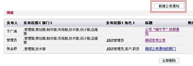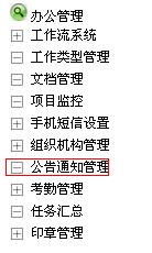 一.新建公告通知:建立完功能菜單后,找到你建立的位置,我們放在了“人力資源管理”下,點擊“”公告通知管理,看到如下圖: