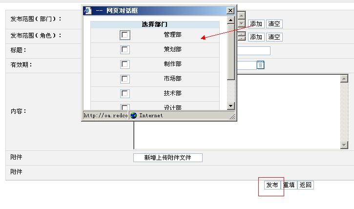 點擊了公告管理,我們就可以現(xiàn)來創(chuàng)建一個新的公告了,點擊“新建公告通知”按鈕,會彈出一個新建公告的頁面,在選擇發(fā)布部門時,點擊后面的“添加”就可以選擇發(fā)布公告通知的部門范圍了,如圖: