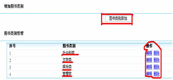 填寫了類別的名字后,可以提交,成功后跳轉(zhuǎn)到圖二頁面,在圖二頁面中,可以對圖書類別進行修改,刪除。
