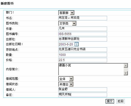 進入上圖是根據(jù)提示進行添加,提交后跳轉(zhuǎn)到圖四中,可以根據(jù)您的要求,來查詢您想看的書的具體信息,查詢出的的圖示如下(圖六):