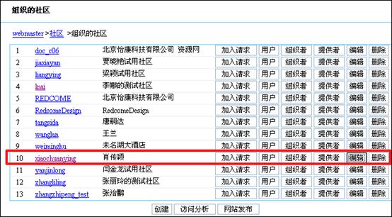 輸入用戶名、密碼進(jìn)入網(wǎng)站,點(diǎn)“管理社區(qū)”,進(jìn)入“組織的社區(qū)”頁(yè)面。這里可以看到該站點(diǎn)下所有的社區(qū)。