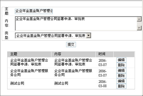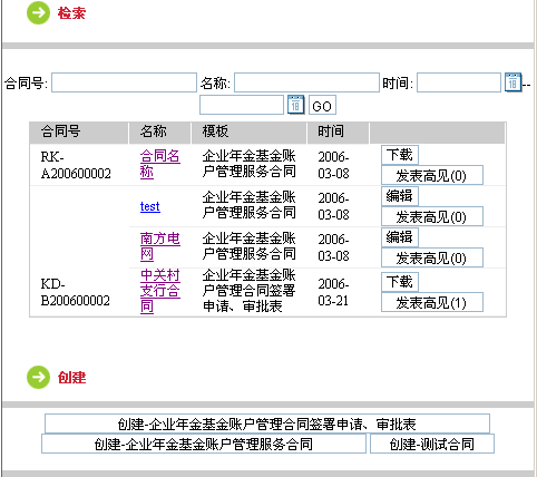 下方是現(xiàn)有全部合同的記錄,記錄著合同編號(hào)、合同名稱、模板類型、創(chuàng)建時(shí)間、創(chuàng)建會(huì)員ID,每條合同后都有發(fā)表高見,發(fā)表高見后的數(shù)字代表該合同有幾條高見;點(diǎn)擊合同名稱,將彈出合同的顯示頁面,可觀看到合同的具體內(nèi)容;可以看到通過審核的合同會(huì)出現(xiàn)一個(gè)合同號(hào),而沒有通過審核的則沒有。合同號(hào)中RK為合同模板類型,A表示為企業(yè)年金理事會(huì),B表示為法人受托機(jī)構(gòu),字母后面的數(shù)字表示該合同的編號(hào)。通過審核的合同可以供用戶下載,如果未通過審核必須修改編輯,直到通過審核才能被用戶下載。