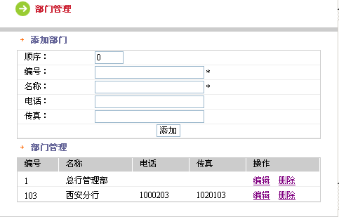 添加、編輯、刪除公司管理部門。添加部門時(shí),輸入順序也就是部門的顯示順序,數(shù)字越小部門就越前顯示。部門編號(hào)及名稱是屬于必須填寫的內(nèi)容,電話和傳真可由可無,填好資料后點(diǎn)擊添加,一個(gè)新的部門就建好了。