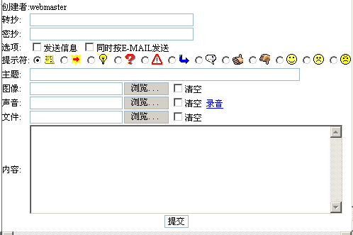 轉(zhuǎn)抄,密抄(加密發(fā)送,防止被其他人所見)用于發(fā)送給其它用戶,填入要發(fā)送的電子郵件地址即可。填入要勾選發(fā)送信息,將會(huì)給用戶發(fā)送一條社區(qū)短信息。勾選同時(shí)按E-MAIL發(fā)送將會(huì)發(fā)送一封電子郵件。填入主題,內(nèi)容,也可以上傳圖像、聲音和附件,填好后點(diǎn)擊提交就可以了。