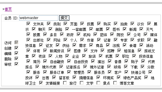 3、填入會(huì)員ID,在可以允許該用戶對(duì)其內(nèi)容進(jìn)行操作的項(xiàng)目上打勾,點(diǎn)擊提交完成。