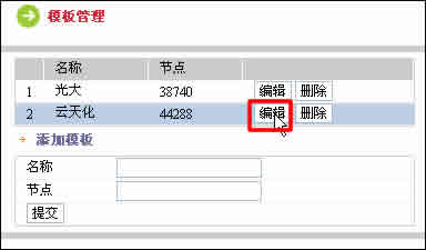打開“模板管理”頁(yè)面。名稱填入模板名稱,節(jié)點(diǎn)就填定義為模板的社區(qū)節(jié)點(diǎn)號(hào)。添完以后,點(diǎn)“提交”,就完成了模板的定義。如圖所示: