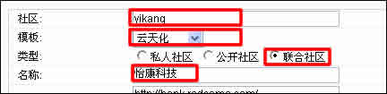 如圖所示,按照紅色方框提示,填寫社區(qū)、模板、選擇類型、填寫名稱。其他區(qū)域都不做改動(dòng)。注意:“社區(qū)”一定要填英文,不能填中文。