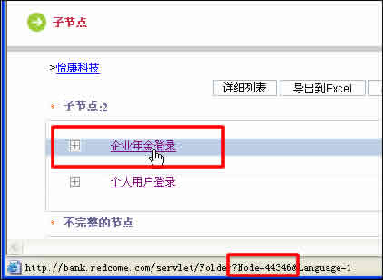 把鼠標(biāo)放在“企業(yè)年金登錄”上,可以看到狀態(tài)欄出現(xiàn)一行字母,其中包含了“企業(yè)年金登錄”的節(jié)點(diǎn)號(hào)為“Node=44346”,如紅色方框內(nèi)所示。把這個(gè)節(jié)點(diǎn)號(hào)“44346”記下來(lái),在3.3修改登錄鏈接的時(shí)候有用。