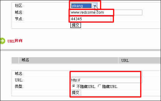 社區(qū)選擇“yikang”,節(jié)點(diǎn)號(hào)就是前面已經(jīng)記下的“yikang”的節(jié)點(diǎn)號(hào)“44345”(沒記下來(lái),可以參照 2.2 編輯社區(qū)屬性)。域名需要提前定好。URL轉(zhuǎn)向隨需要而定。