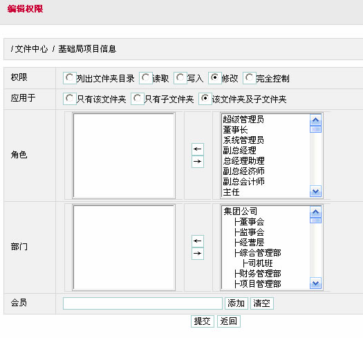 文件管理羅列了對文件管理的權(quán)限、角色、部門、是否為會員、是否有繼承權(quán)利以及權(quán)限的范圍;如圖: