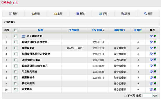 功能介紹:用戶可以查看到對應(yīng)欄目下的文件的主題、編制部門、下發(fā)日期、文件編號等信息,并根據(jù)權(quán)限下載或上傳相關(guān)文件或?qū)ξ募r行修改。