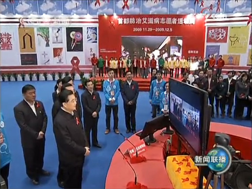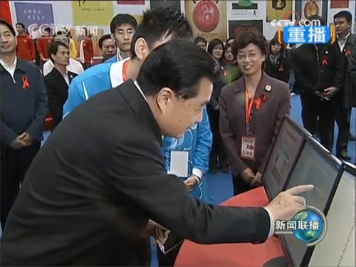 11月30日上午,在第22個(gè)世界艾滋病日到來之際,胡錦濤總書記和中共中央政治局常委、國務(wù)院副總理李克強(qiáng)來到國家會(huì)議中心,參加首都防治艾滋病志愿者活動(dòng)。胡錦濤代表黨中央,向?yàn)榉乐伟滩∽鞒鲐暙I(xiàn)的廣大醫(yī)療衛(wèi)生工作者和志愿者表示誠摯的問候。