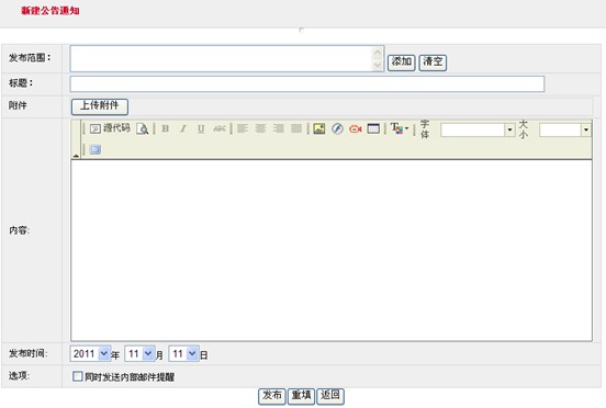 公告通知是管理員對內部人員發(fā)送的通知,只有發(fā)送范圍之內的人員才可以看到;管理員可以創(chuàng)建、預覽、刪除、終止公告,如下圖:![]() 創(chuàng)建公告通知,點擊新建公告通知按鈕進入公告的創(chuàng)建頁面,如下圖: ![]() 發(fā)布范圍:選擇發(fā)送公告通知的人員范圍;點擊輸入框后面的添加按鈕會彈出一個窗口,然后選擇發(fā)送的人員,系統(tǒng)會自動將此郵件發(fā)送到已選人員的內部郵箱中;如下圖所示: ![]() 默認分類中可以按人員、部門分類:如果想按人員分類選擇列表中將會列出所有的人員,選擇人員發(fā)送信息;如果按部門分類,列表中會顯示所有部門,選擇要發(fā)送的部門信息會自動發(fā)送到這個部門的所有人員中; 個性化分類:可以根據(jù)自己的喜好創(chuàng)建分組發(fā)送郵件; >選項:同時發(fā)送內部郵件提醒是指發(fā)送內部消息,當收件者打開郵箱會彈出提示框告訴對方有新的內部消息提示; 選擇發(fā)布范圍、填寫公告標題及內容即發(fā)布公告通知完成;然后系統(tǒng)會自動將公告通知發(fā)送給相關的人員; |