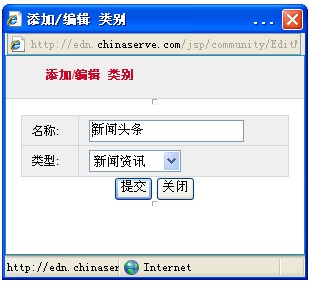 4、點擊創(chuàng)建按鈕彈出新的窗口,在新的窗口中輸入類別名稱及選擇類別的類型,點擊提交自定義文章分類就建好了;在自定義文章分類建好的同時系統(tǒng)會自動在網(wǎng)站的列舉選項中和文章頻道選項中添加自定義文章的分類;自定義文章分類創(chuàng)建頁面如下圖所示:
