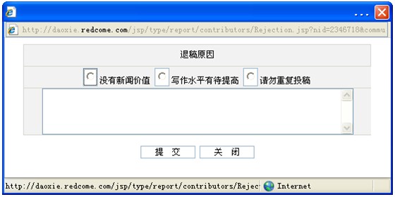 退稿:文件不符合要求及規(guī)定,將投稿退回給會員;點擊退稿彈出窗口可以寫退稿原因;如下圖: