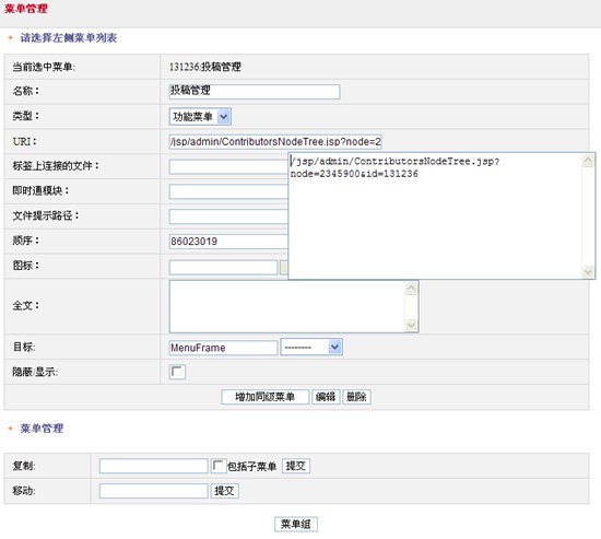 進(jìn)入網(wǎng)站后臺管理,點擊系統(tǒng)管理創(chuàng)建投稿管理的功能欄目菜單;在創(chuàng)建功能菜單的時候在目標(biāo)處填寫:MenuFrame,讓投稿管理的功能菜單在頁面的左側(cè)顯示;創(chuàng)建投稿功能如下圖所示: