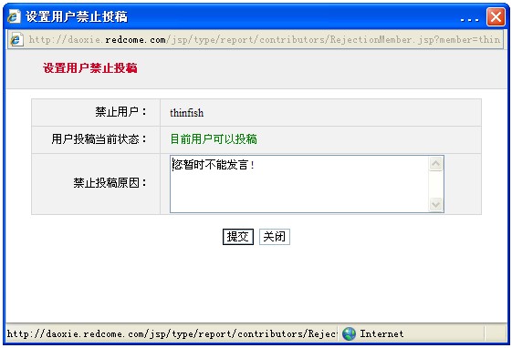 :禁止會員投稿,如設(shè)置之后此會員將不能投稿;點擊按鈕彈出窗口可以查看會員是否被禁止投稿;如要禁止點擊提交即可;在次點擊按鈕即解開禁止投稿;