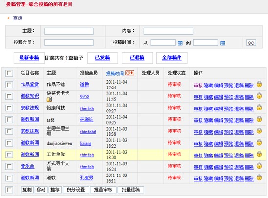 點擊投稿管理進(jìn)入投稿管理頁面,在頁面的左側(cè)會自動提取投稿的欄目菜單,可以分別瀏覽各個欄目下的投稿,然后進(jìn)行管理,如下圖所示: