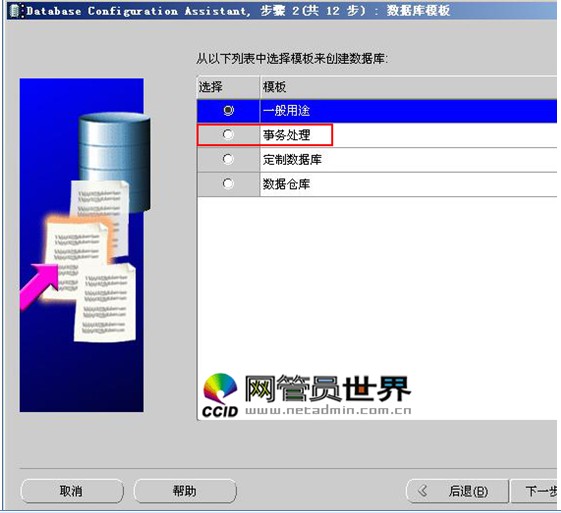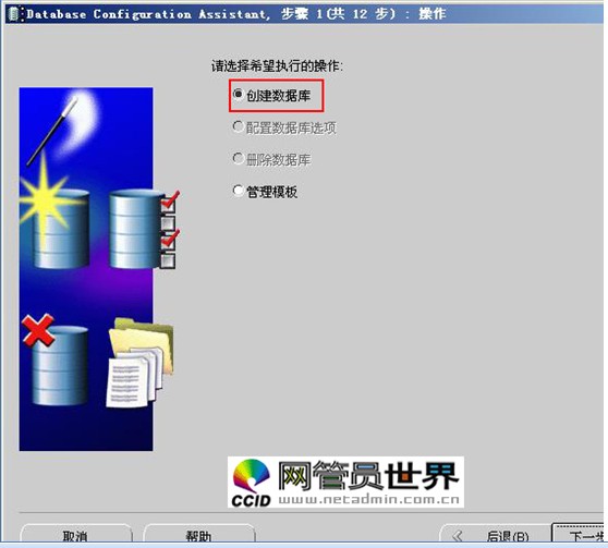 ![]() 圖3 如果是第一次創(chuàng)建數(shù)據(jù)庫,只能創(chuàng)建數(shù)據(jù)庫和管理模板可以使用,選擇創(chuàng)建數(shù)據(jù)庫,單擊“下一步”,會出現(xiàn)數(shù)據(jù)庫模板對話框,如圖4: