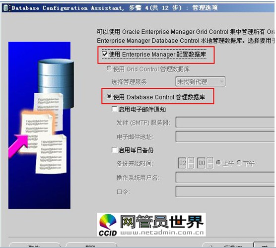 ![]() 圖6 如果要集中管理所有的Oracle數(shù)據(jù)庫,那就要選擇“Grid Control管理數(shù)據(jù)庫”,如果只管理本地數(shù)據(jù)庫,那就選擇“使用Database Control管理數(shù)據(jù)庫”。 選擇“使用Database Control管理數(shù)據(jù)庫”,單擊“下一步”,會出現(xiàn)“數(shù)據(jù)庫身份證明”對話框,該對話框用于設(shè)置初始數(shù)據(jù)庫用戶帳號的口令。如圖7: