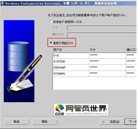 ![]() 圖7 要選擇用戶SYS、SYSTEM、DBSNMP、SYSMAN使用相同的口令,那就選擇“所有賬戶使用同一口令”。這里選擇“使用不同的口令”,分別設(shè)置用戶的口令:SYS用戶的口令為ORACLE,SYSTEM用戶的口令為MANAGER,DBSNMP用戶的口令為DBSNMP,SYSMAN用戶的口令為SYSMAN。