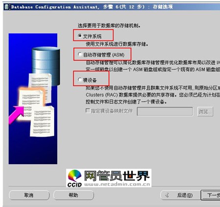 設(shè)置口令后,單擊“下一步”,會出現(xiàn)“存儲選項”對話框,該對話框用于指定數(shù)據(jù)庫的存儲機制(文件系統(tǒng)、自動存儲管理、裸設(shè)備),如圖8: