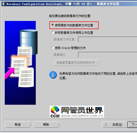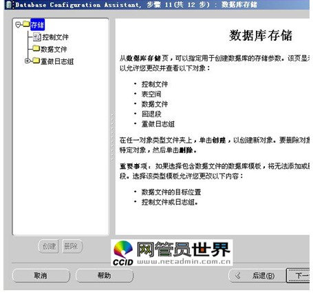 單擊“下一步”,會出現(xiàn)“數(shù)據(jù)庫存儲”對話框,該對話框用指定控制文件、數(shù)據(jù)文件、重做日志文件、名稱和尺寸。如圖13: