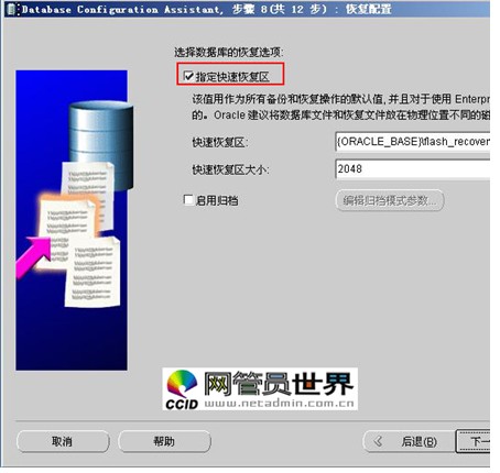 快速恢復(fù)區(qū)用于恢復(fù)數(shù)據(jù),以免系統(tǒng)發(fā)生故障時丟失數(shù)據(jù);啟用歸檔用于將數(shù)據(jù)庫設(shè)置為ARCHIVELOG模式,使得當數(shù)據(jù)庫出現(xiàn)失敗時可以完全恢復(fù)數(shù)據(jù)庫數(shù)據(jù)。
