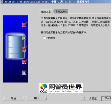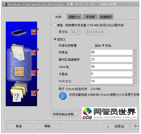 單擊“下一步”,會出現(xiàn)“數(shù)據(jù)庫內(nèi)容”對話框,該對話框用指定是否安裝示例方案,并運行自定義腳本。如圖11: ![]() 圖11 單擊“下一步”,會出現(xiàn)“初始化參數(shù)”對話框,該對話框用配置初始化參數(shù)、數(shù)據(jù)庫字符集和連接模式。如圖12: