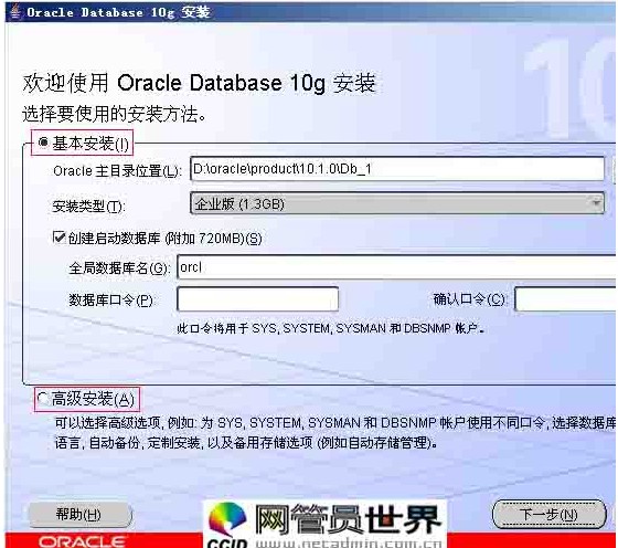 ![]() 圖2 在安裝Oracle DataBase 10g時可以選擇“基本安裝”和“高級安裝”兩種方法。選擇“基本安裝”時,“Oracle主目錄位置”用于指定Oracle DataBase 10g軟件的存放位置;“安裝類型”用于指定Oracle產(chǎn)品的安裝類型(企業(yè)版、標準版和個人版)。如果選擇“創(chuàng)建啟動數(shù)據(jù)庫”,那就要指定全局數(shù)據(jù)庫名稱和數(shù)據(jù)庫用戶的口令。