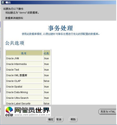 單擊“完成”,會顯示“確認”對話框,列出了要安裝Oracle選項的所有信息。如圖15: