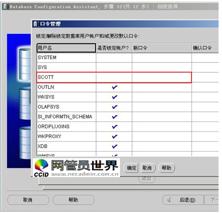 當建立完成數(shù)據(jù)庫后,系統(tǒng)會鎖定除SYS、SYSTEM、DBSNMP、SYSMAN之外的所有其他用戶。應(yīng)為以后要使用SCOTT用戶,所以在點擊“口令管理”按鈕后,解鎖SCOTT用戶,如圖18: