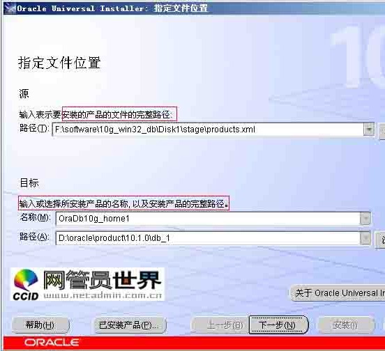 選擇“高級安裝”,單擊“下一步”,會出現(xiàn)“指定文件對話框”,在源路徑顯示的是安裝產(chǎn)品所在的磁盤路徑;目標名稱用于資定Oracle主目錄所對應(yīng)的環(huán)境變量,目標路徑用于指定安裝Oracle軟件的目標安裝路徑。設(shè)置目標名稱為:OraDb10g_home1,目標路徑為:D:oracleproduct10.1.0db1。如圖3:
