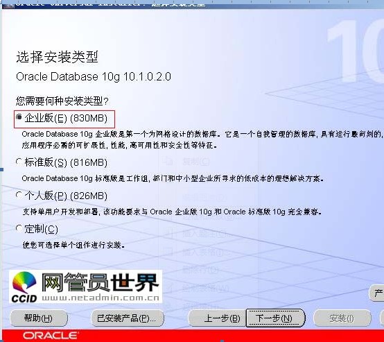 ![]() 圖3 單擊“下一步”,會加載Oracle產(chǎn)品列表,然后出現(xiàn)“選擇安裝類型”對話框;如圖4: