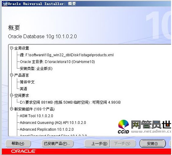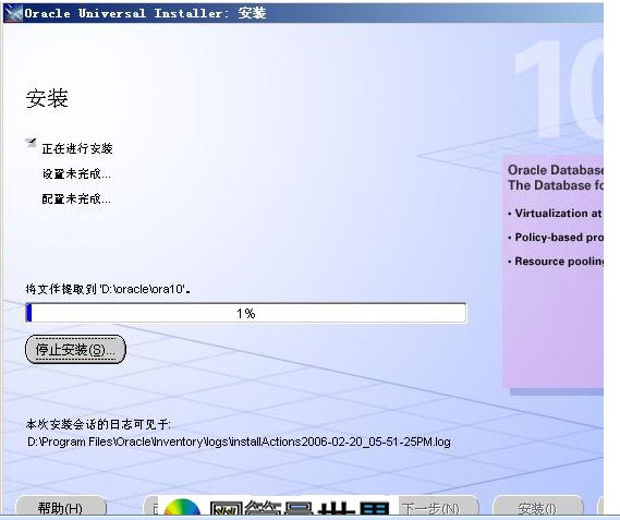 ![]() 圖6 單擊“安裝”,就會開始安裝Oracle DataBase 10g產(chǎn)品了。如圖7為安裝過程: