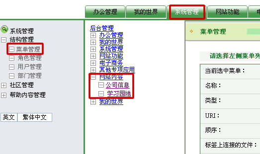 第一步: 用戶登陸到后臺(tái)界面,點(diǎn)擊“系統(tǒng)管理”按鈕,接著點(diǎn)擊左邊菜單欄中“菜單管理”,此時(shí)右邊出現(xiàn)后臺(tái)管理的菜單欄和菜單管理頁面;點(diǎn)擊后臺(tái)管理頁面中的“網(wǎng)站內(nèi)容”(即后臺(tái)桌面顯示的標(biāo)簽組);