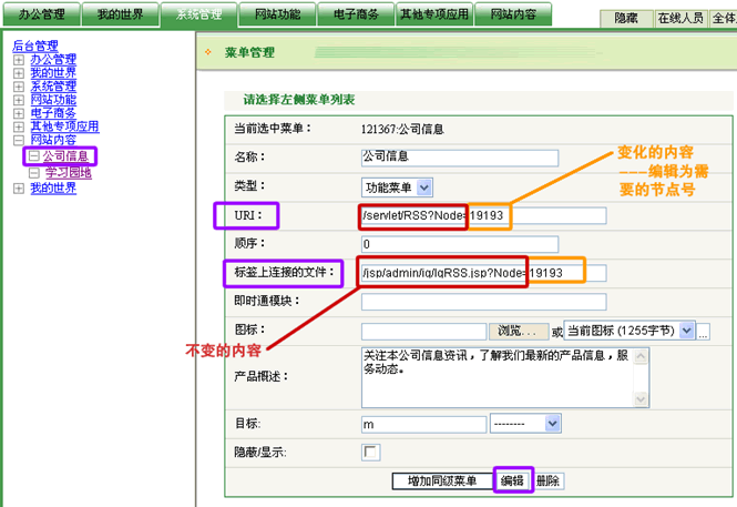 其中,“***”為前臺(tái)某類信息的父親節(jié)點(diǎn)號(hào);"/servlet/RSS?Node="和“/jsp/admin/ig/IgRSS.jsp?Node=”為不變必填的內(nèi)容;
