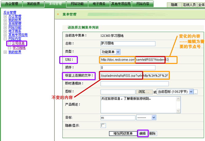 對(duì)其中的“URI”選項(xiàng)和“標(biāo)簽上連接的文件”選項(xiàng)進(jìn)行編輯,分別對(duì)應(yīng)的填入“/servlet/RSS?Node=***”和“/jsp/admin/ig/IgRSS.jsp?Node=***”;