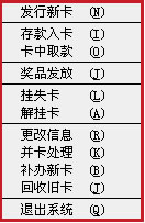此菜單的功能主要是:用于當(dāng)用戶的卡由于各種原因丟失時,可以到店里進(jìn)行掛失處理,防止別人撿到時冒充消費(fèi),掛失后可以再補(bǔ)辦一張新卡(詳見[補(bǔ)辦新卡]),當(dāng)然,當(dāng)用戶找到原卡時還可到店里對卡進(jìn)行解掛,(詳見[解掛卡])。